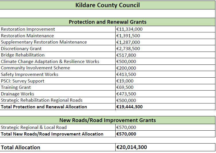 Kildare is to receive just over €20 million in Department of Transport funding for regional and local roads in 2026.