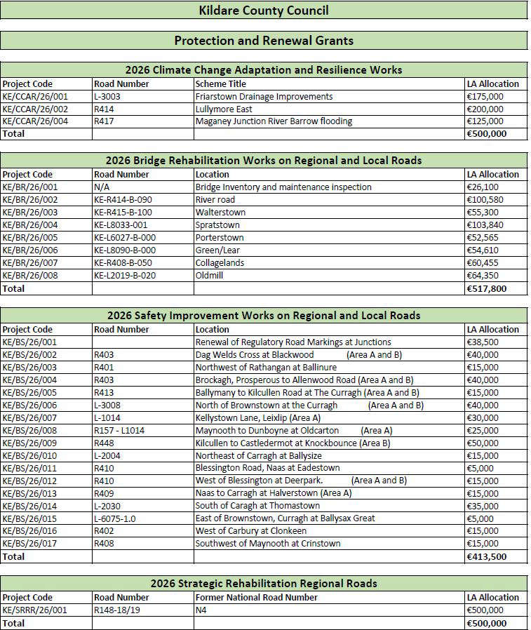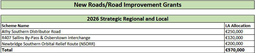 The largest share - €11.33 million - is going toward new road construction and major improvement works, including continued progress on the Athy Southern Distributor Road, the R407 Sallins Bypass and Osberstown Interchange, and the Newbridge Southern Orbital Relief Route.