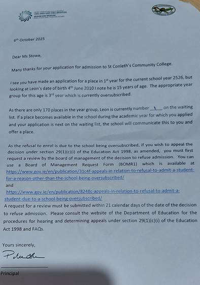 One school, St. Conleth's Community College in Naas, advised the family that Leon was too old to enter first year and suggested placing him in third year instead.