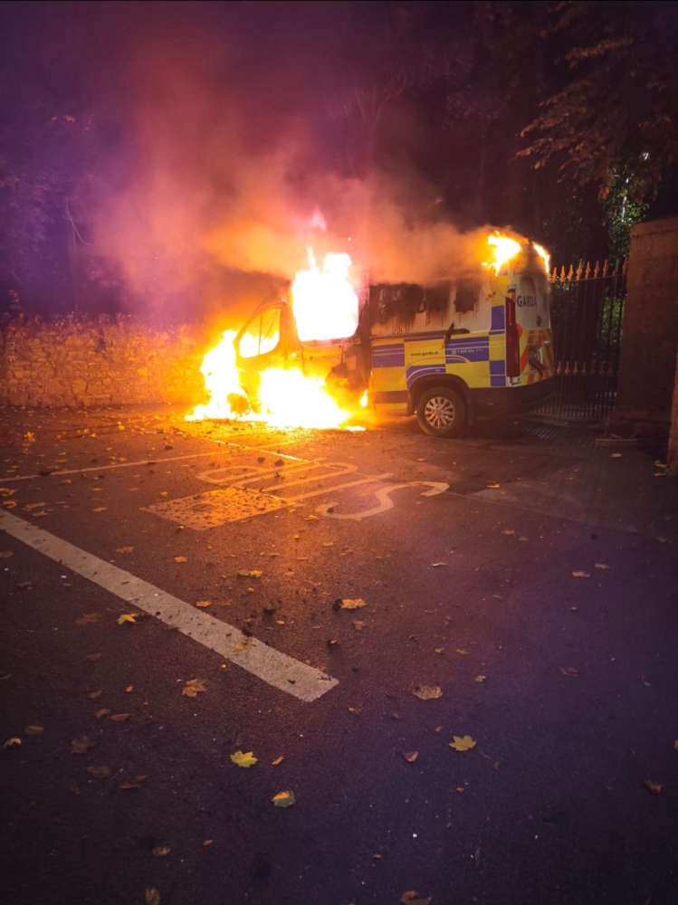 Garda van up in flames outside the IPAS centre at Citywest. Cowd of well over 500 present. Public Order Unit gardai charged a big group back from centre entrance, pepper spray deployed pic.twitter.com/yCBEZqWc29