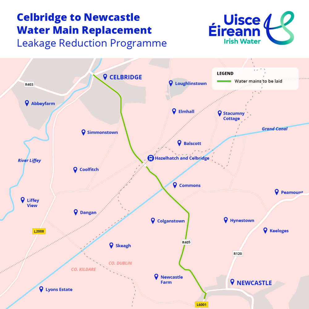 The works will take place in four stages and involve the replacement of over five kilometres of aged water mains between Celbridge and Newcastle, Co. Dublin as part of Uisce Éireann’s National Leakage Reduction Programme.